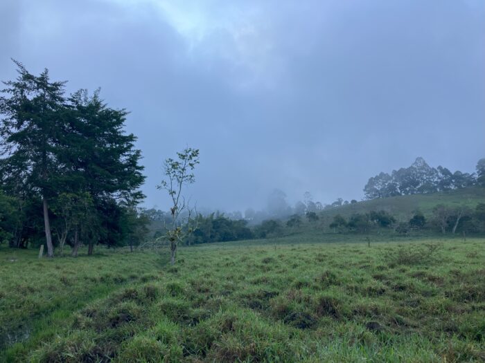 Salgo al pueblo hermoso con una vista espectacular. En el Camino Real descubro una araña grande, negra y peluda, y muy muerta. Las aves trinan y a veces es como si estuviera estoy caminando en un bosque encantado. Subo lentamente y entro una vereda. Caminar en las veredas es tan maravilloso como espantoso. Es maravilloso porque me permite ver la vida cotidiana y escuchar todas las redes de la radio, en una finca aún más fuerte que en la otra.